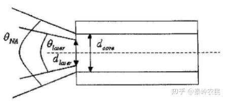 从上面的图1.7可以看到,激光与光纤的耦合应满足的条件,激光光束的光斑直径dlaser 和光束发散角θlaser 应满足 :